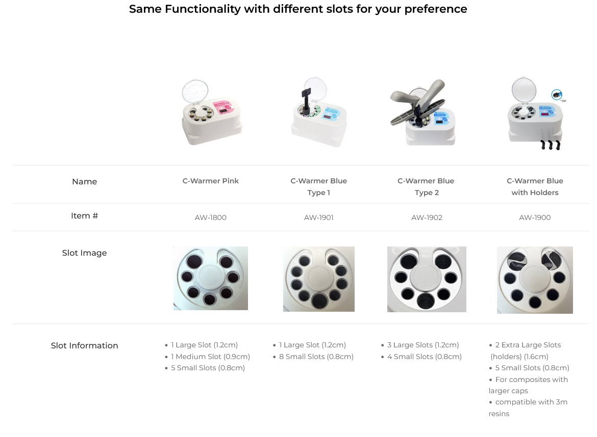 C-Warmer is designed to enhance both the doctors' and patients' comforts. A thermostatically-controlled cartridge/composite warmer significantly reduces curing time with more flowability of composites and conveniently warms anesthetics and composites in one location. It also improves patient's comfort by delivering the restorations at body temperature with "less injection pain." Its user-friendly operation, compact size, and function will provide a significant impact on the everyday clinical routine.