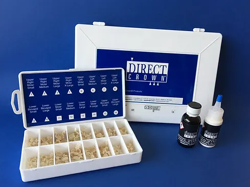 Adult Posterior Kit includes 112 Opaque crown shells in sizes 1-16, one 1oz mixing Powder (universal shade D3), one 1oz acrylic liquid, five mixing bowls, one dropper and instructions for use. #1 Upper Right Molar Small #2 Upper Right Molar Medium #3 Upper Right Molar Large #4 Upper Right Molar X-Large #5 Upper Left Molar Small #6 Upper Left Molar Medium #7 Upper Left Molar Large #8 Upper Left Molar X-Large #9 Lower Bicuspid Small #10 Lower Bicuspid Large #11 Lower Molar Small #12 Lower Molar Medium #13 Lower Molar Large #14 Lower Molar X-Large #15 Upper Bicuspid Small #16 Upper Bicuspid Large