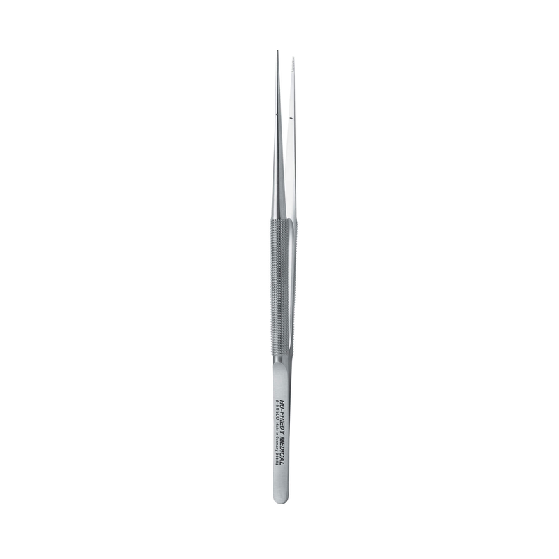 Microsurgical diamond dusted tissue pliers used to grasp and stabilize soft tissue, 7" length.