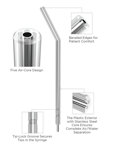 Disposable air/water syringe tips with plastic exterior and metal interior. They are interchangeable with most metal tips, no conversion necessary. A groove in the tip ensures a snug locking fit so that the tip stays in place throughout the procedure. Does not damage O-Ring.
